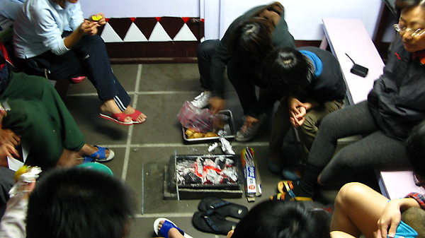 今天外面濕濕的沒辦法升營火 我們就把烤爐搬到屋子裡來